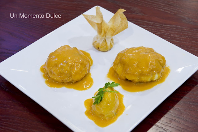 Finalmente sobre llos filetes de Rape Relleno, le ponemos un poco de la Crema de Marisco anterior.
