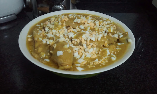 El majado anterior se lo agregamos al pollo, cocinándolo hasta que este tierno .(depende del tipo de pollo, si es de corral o granja).