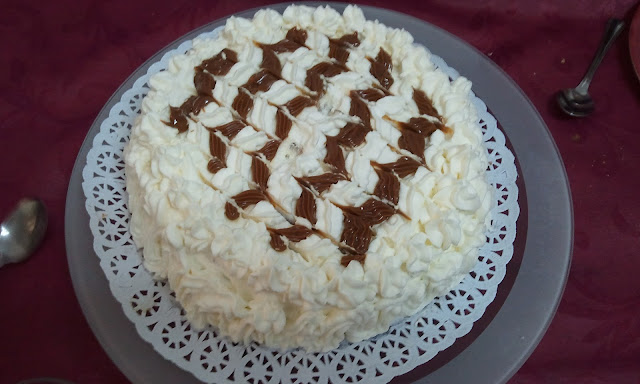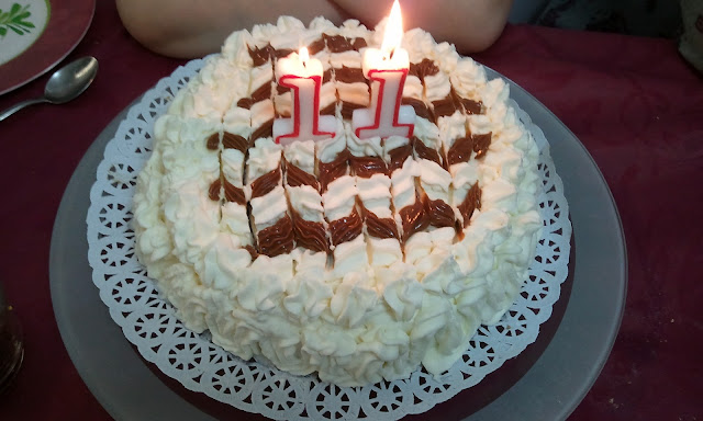 | En esta tarta utilicé el pionono de chocolate las dos planchas, que como veis era cuando mi hijo cumplió 11 años. |