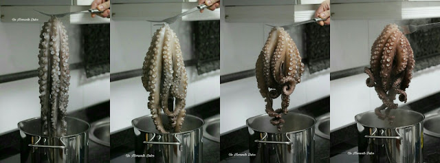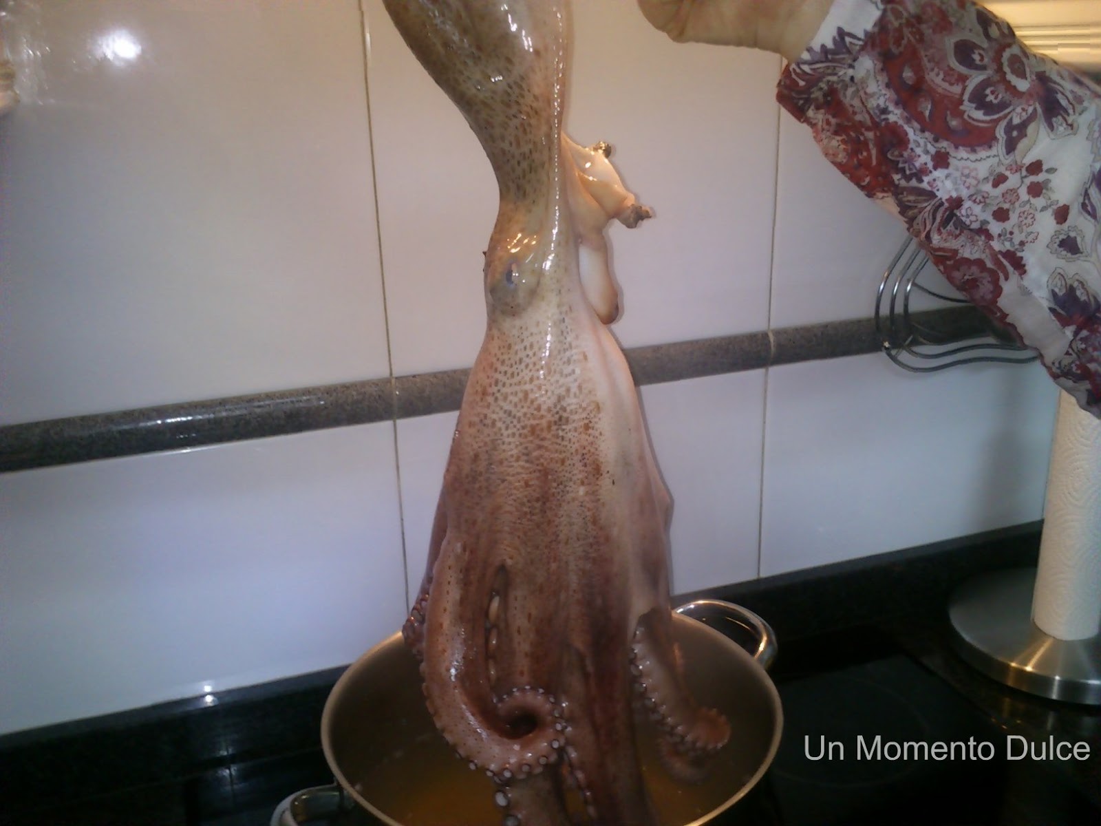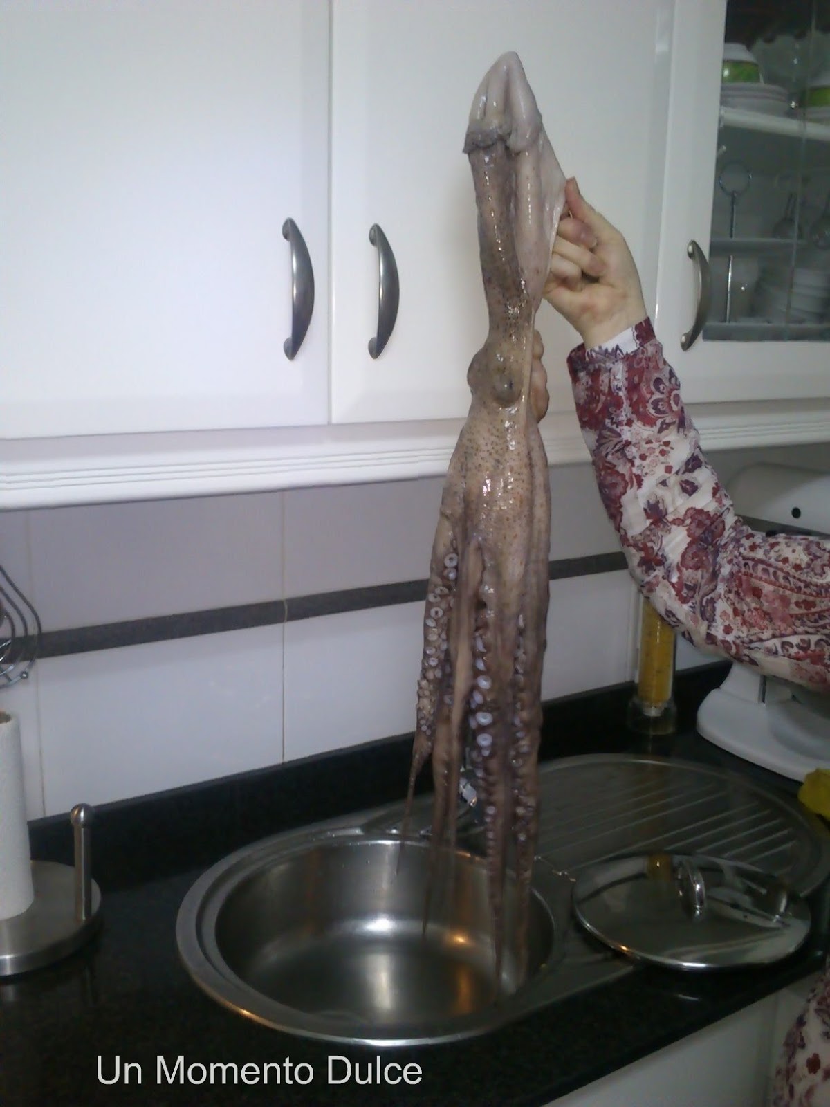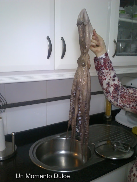 | Para sacar la foto de los sustos del pulpo, mi marido en esta ocasión lo pincho por la boca, lo ideal es agarrarlo por la cabeza. |