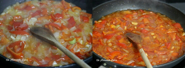 Mientras, empezamos con el guiso, vamos dorando los ajos en el aceite, seguimos pochando la cebolla picada finamente y pimientos.