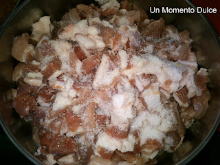 En una cacerola que nos quepa holgadamente la carne, le echamos un dedo de agua en el fondo, seguidamente la carne troceada y 1,5 cucharadas de sal gorda ( entre 1 a 1,5 cucharadas de sal, más cantidad no, de lo contrario quedarían salados, para mi opinión el punto óptimo de sal es 1,5 cucharadas).