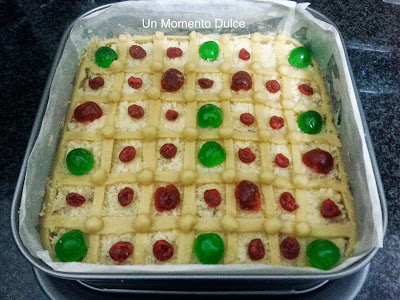 | Antes de hornear, la Tarta de Coco y Cabello de Ángel, con adornos de Masa Quebrada. |