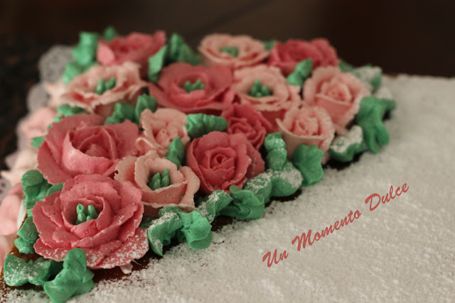 - Crema Suiza (70 gr.de claras + 130 gr.de azúcar + una pizca de crémor tártaro + 160 de mantequilla a temperatura ambiente + colores en gel) (para decorado de flores).