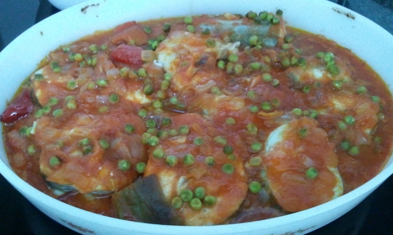 Encima vamos colocado las rodajas de la merluza y los guisantes.