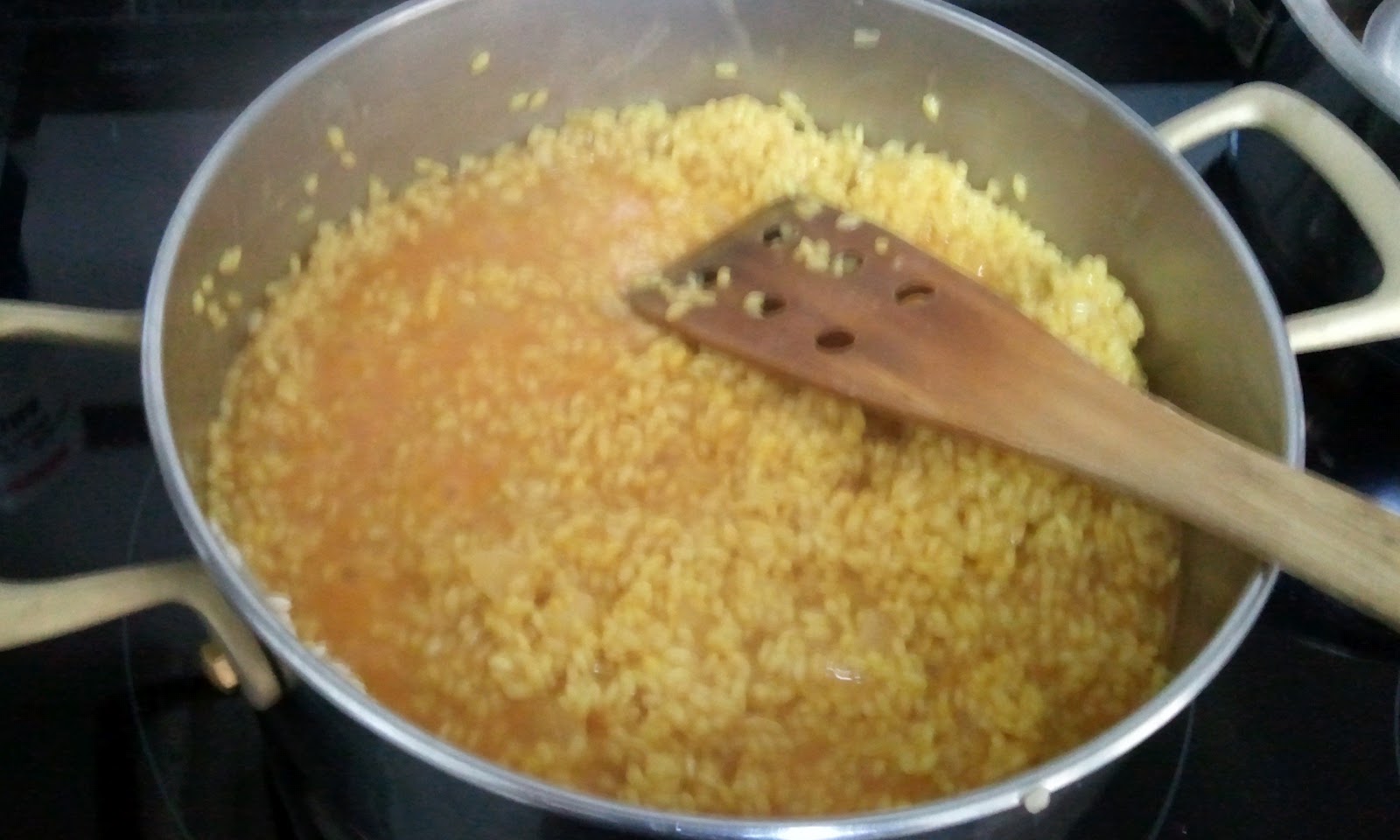 Añadimos al arroz, un cucharón de caldo caliente, revolvemos sin parar hasta que lo haya absorbido todo, seguimos así, agregándole caldo necesario poco a poco hasta que el arroz esté tierno (en uno de los cucharones agregamos el azafrán si lo deseamos).