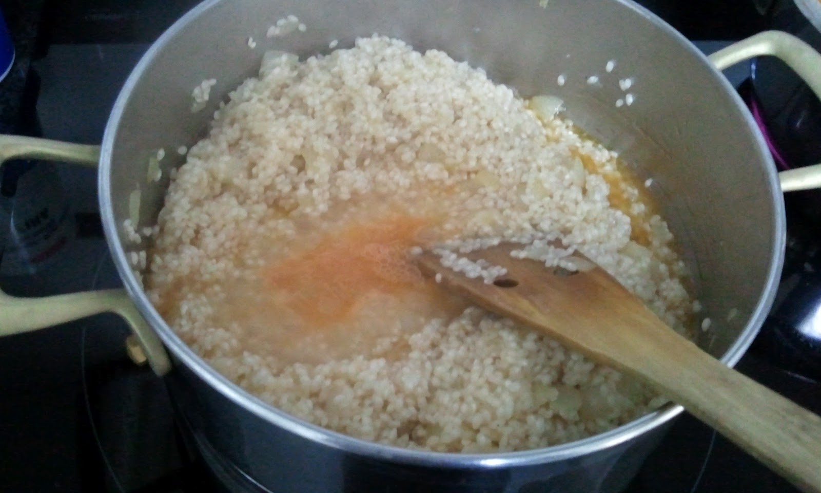 A continuación doramos el arroz, hasta que el grano este transparente.