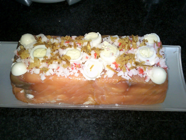 Al servirlo, le damos la vuelta y decoramos a nuestro gusto (yo le puse unas rodajas de huevo de codorniz, surimi rallado y cebolla frita.
