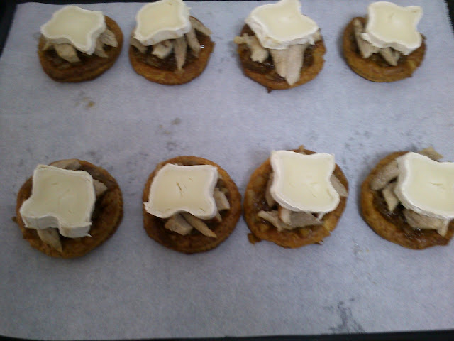 Sobre la masa hojaldrada repartimos nuestra cebolla caramelizada, el secreto troceadito en trozos pequeños y sobre esto la rodaja de queso cabra.