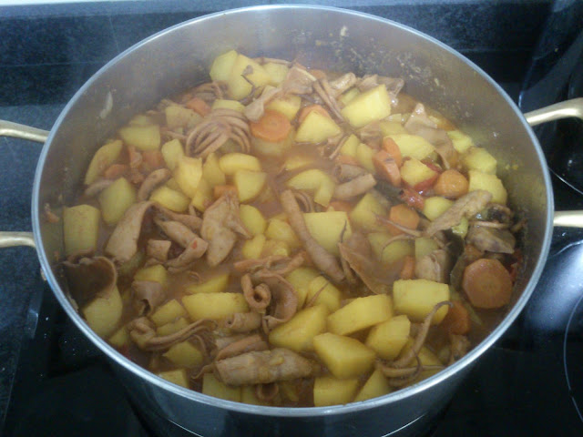 Vigilamos que tenga el suficiente líquido para que no se nos pegue en el fondo de la cacerola. Normalmente le es suficiente, ya que la choupa suelta bastante agua.