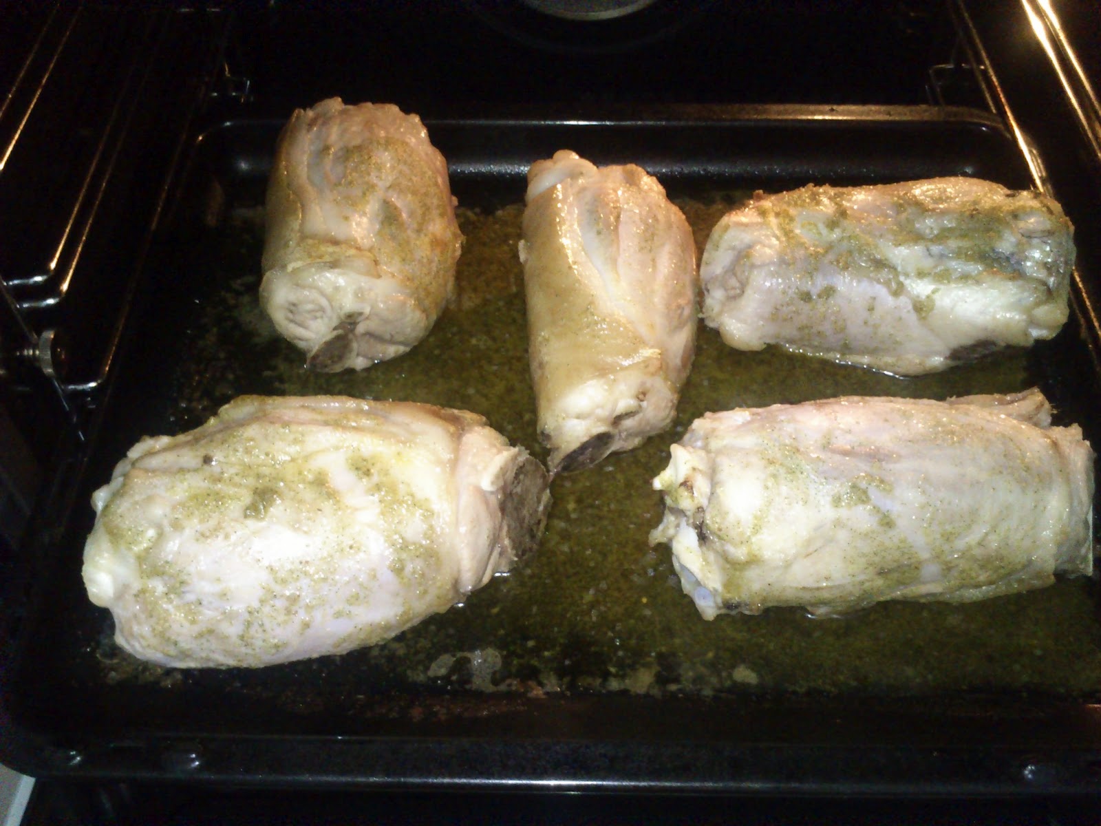 Caliento el horno con el turbo, a 170º, meto la bandeja con los codillos aproximadamente en la mitad del horno, dejándolos cocinar así solos durante unos 10 minutos aproximadamente.