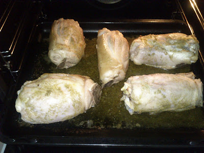 Coloco los codillos en la bandeja del horno y los unto con la mezcla anterior, dejándolo en ese adobo una hora o más antes de asarlos.