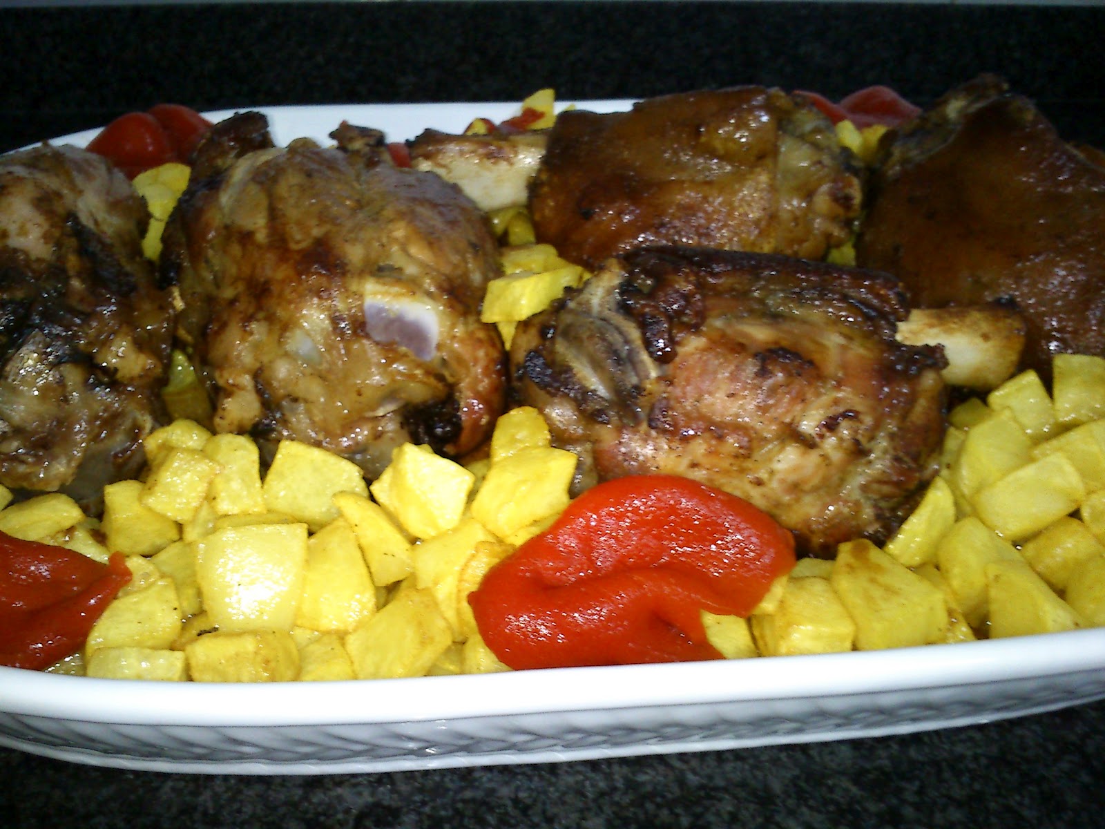 Acompañamos con unas patatas cortadas en cuadrados, a las que después de lavarlas las pasamos por colorante alimentario (azafrán), salamos y las freímos.