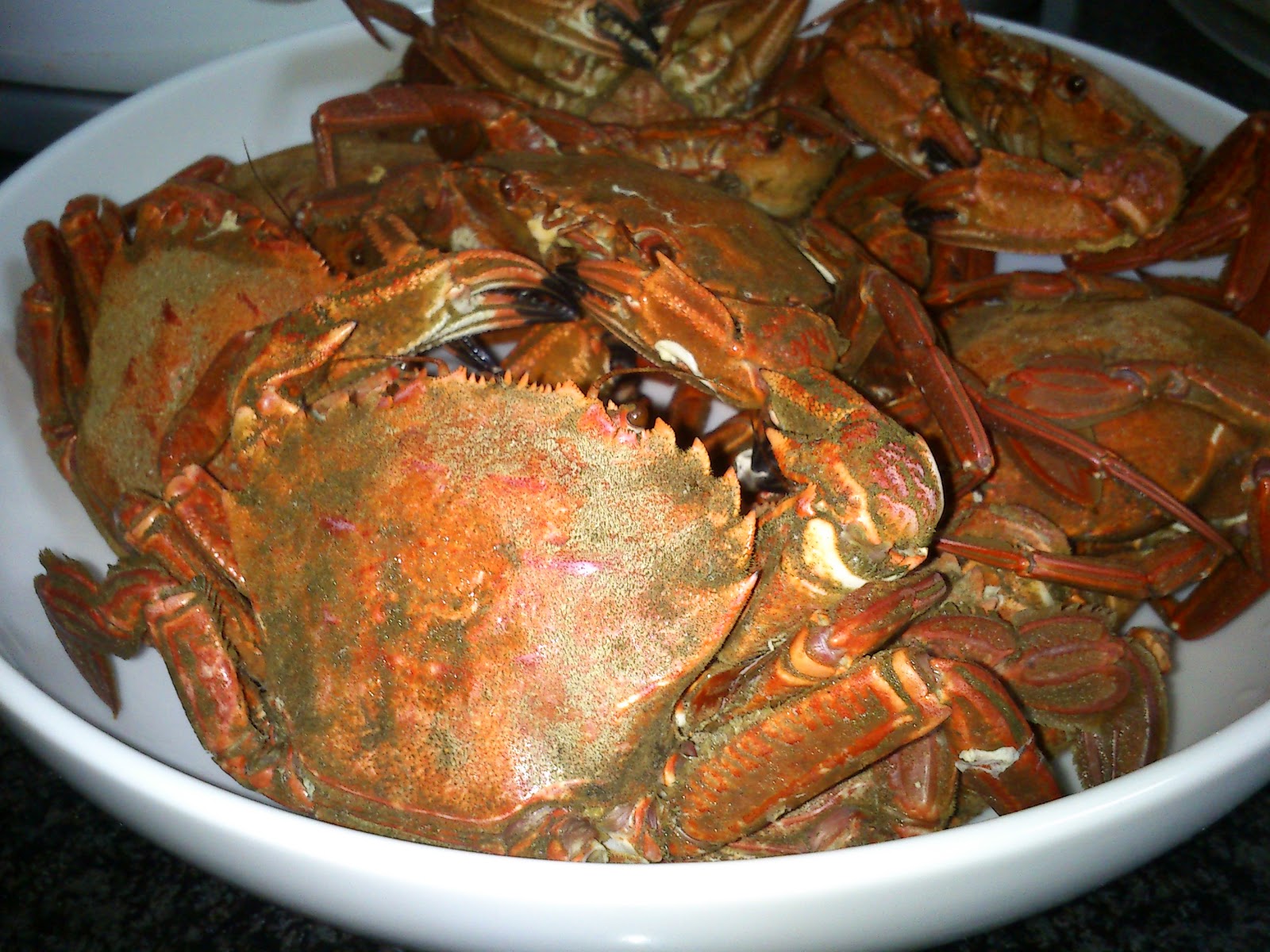 | Aquí tenemos las nécoras abiertas, vemos el coral (naranja) y el caldo (marrón), todo se come... Ummm |