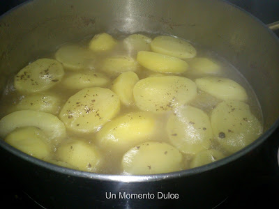 En el agua cocinamos las patatas cortadas en rodajas gorditas.