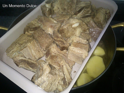OBSERVACIÓN: Cuando cuezo la carne trato de calcular el agua que me quedará para las patatas, pues me gusta que no me sobre, ya que así las patatas la absorben toda y quedan deliciosas.