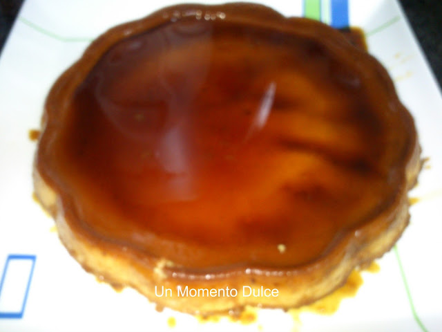 Vertemos sobre el molde cubierto con papel aluminio y lo horneamos hasta que cuaje (sobre 45 minutos), el tiempo depende del horno y del tamaño del flan.