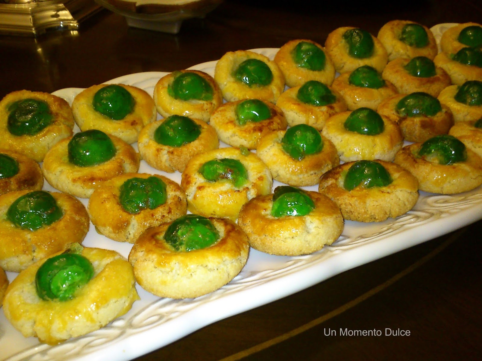 Las pintamos con la clara, y las rebozamos con los piñones, almendra, coco etc., (apretando un poco para que se incruste el rebozado en la masa), yo en esta ocasión la bola la aplané y le puse media guinda (tampoco la barnicé con la clara, ya que no la iba a rebozar).
