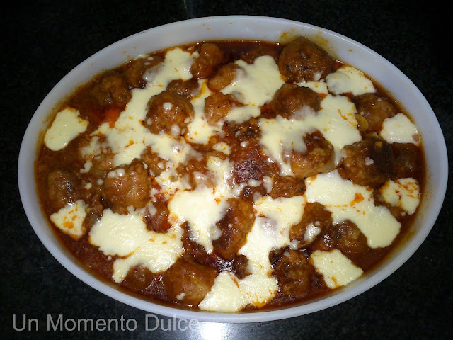 Servimos la pasta en una fuente grande, encima las albóndigas y por encima MUCHO QUESO...