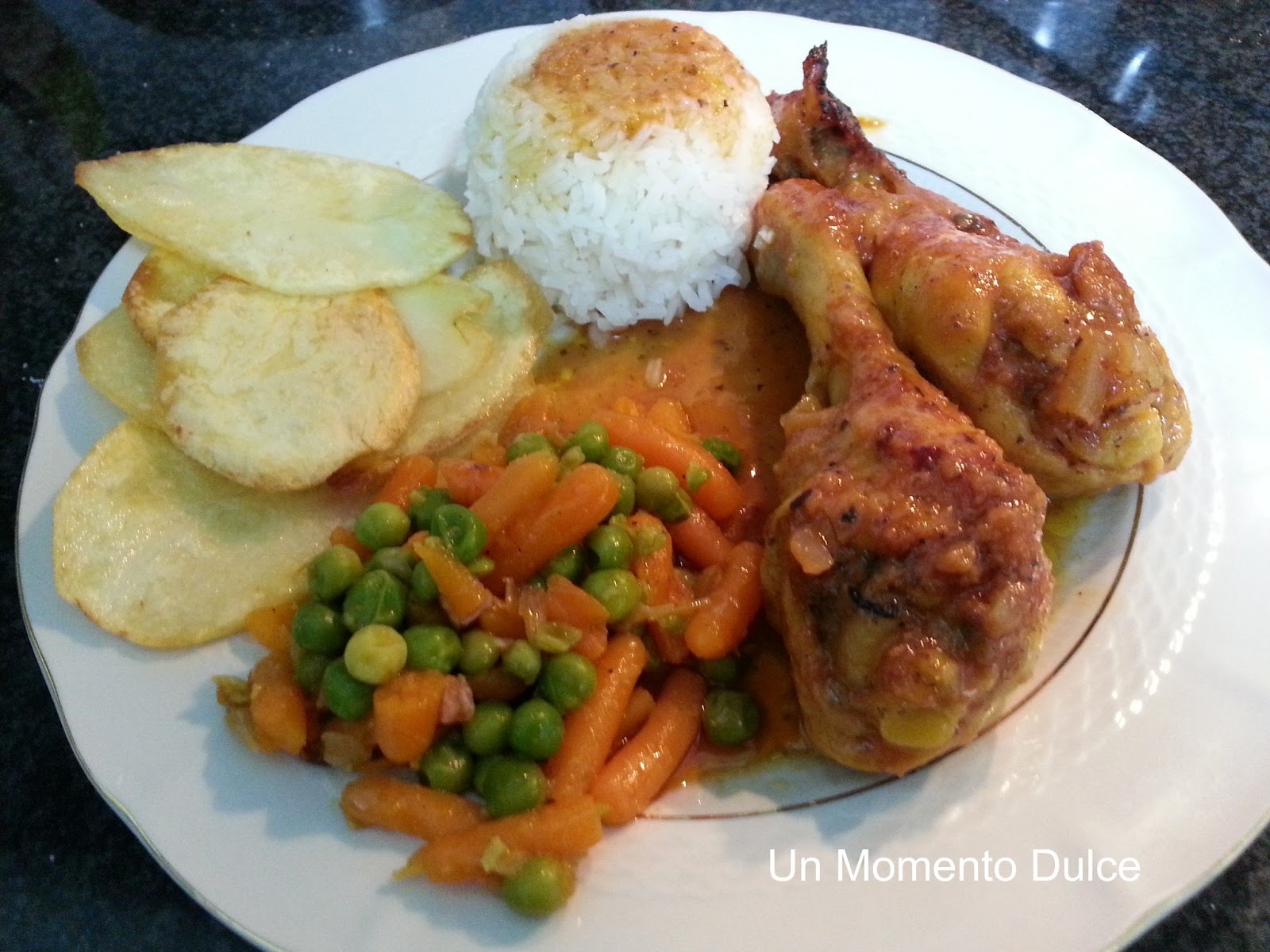 Servimos acompañado de patatas o arroz, según gustos y unos Guisantes y Zanahorias Baby Guisadas.