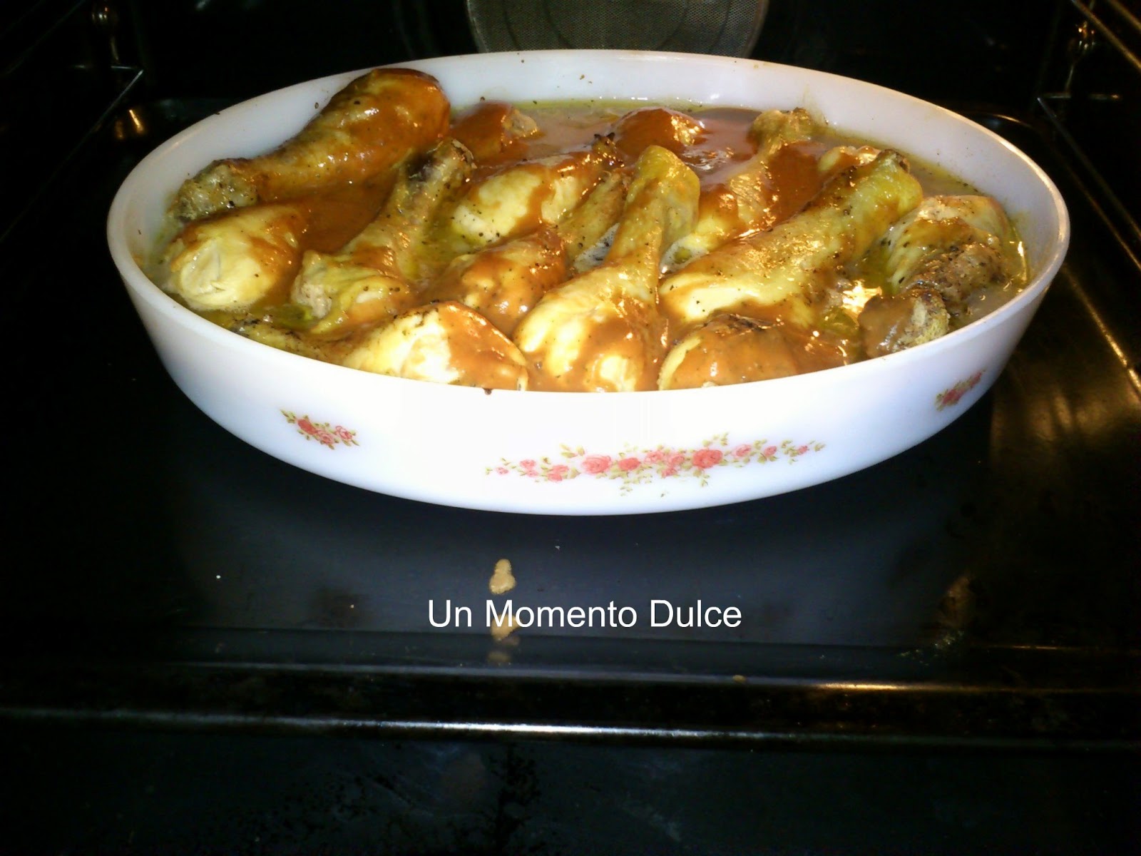 Metemos en el horno precalentado a 180º C, en la parte baja y con el turbo, horneamos durante 45 minutos, transcurridos 10 o 15 minutos le agregamos un chorrito de vino blanco, pero procurando no excedernos ya que el pollo suelta mucho líquido, (le damos una vuelta al los jamoncitos a mitad de cocción).