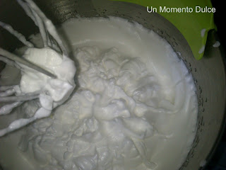 Cuando esté frío preparamos la glasa, para lo cual batimos ligeramente las claras con 1/8 de cucharilla de Cremor Tártaro, sin que lleguen a espumar.