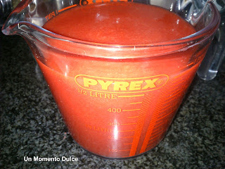 Trituramos las fresas limpias con la batidora y pasamos por el colador.