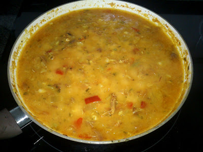 Primero le esparcimos el sofrito, dejándolo un poco caldoso.