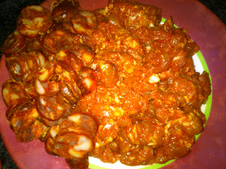 El día anterior (esta mejor si hacemos el amoado de víspera), en una sartén con el aceite pochamos un poco la cebolla, ajo y pimientos muy picados, seguidamente le agregamos la albahaca, perejil, tomate y los chipirones limpios cortados en rodajas y las patas divididas en dos, ya que sueltan mucha agua, y lo tenemos casi desde el principio del sofrito para que se le vaya consumiendo el agua y quede un guiso con el liquido aceitoso.
