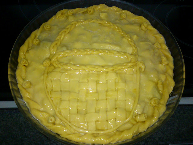 Tapamos con la otra capa de masa, decoramos y barnizamos con el huevo batido.