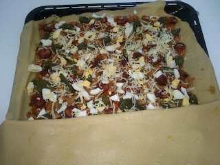 Extendemos una capa de masa sobre la bandeja de horno engrasada con el propio aceite del guiso.