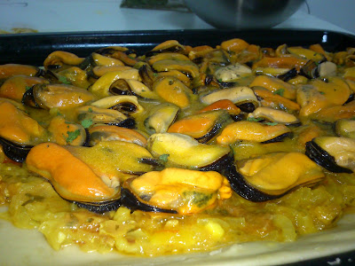 Repartimos los mejillones y berberechos, (los abrimos al vapor, retirandolos enseguida, ya que se seguiran cocinando en la empanada).