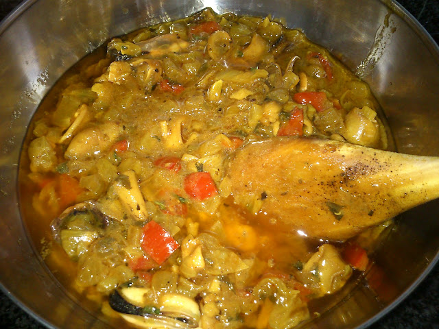 | El guiso, al que le agregue unos poquitos mejillones que tenía aparte. |