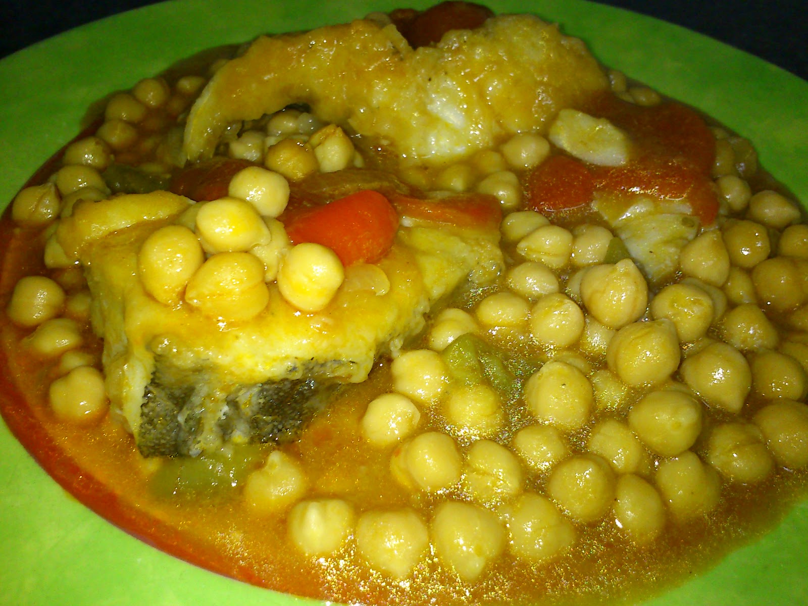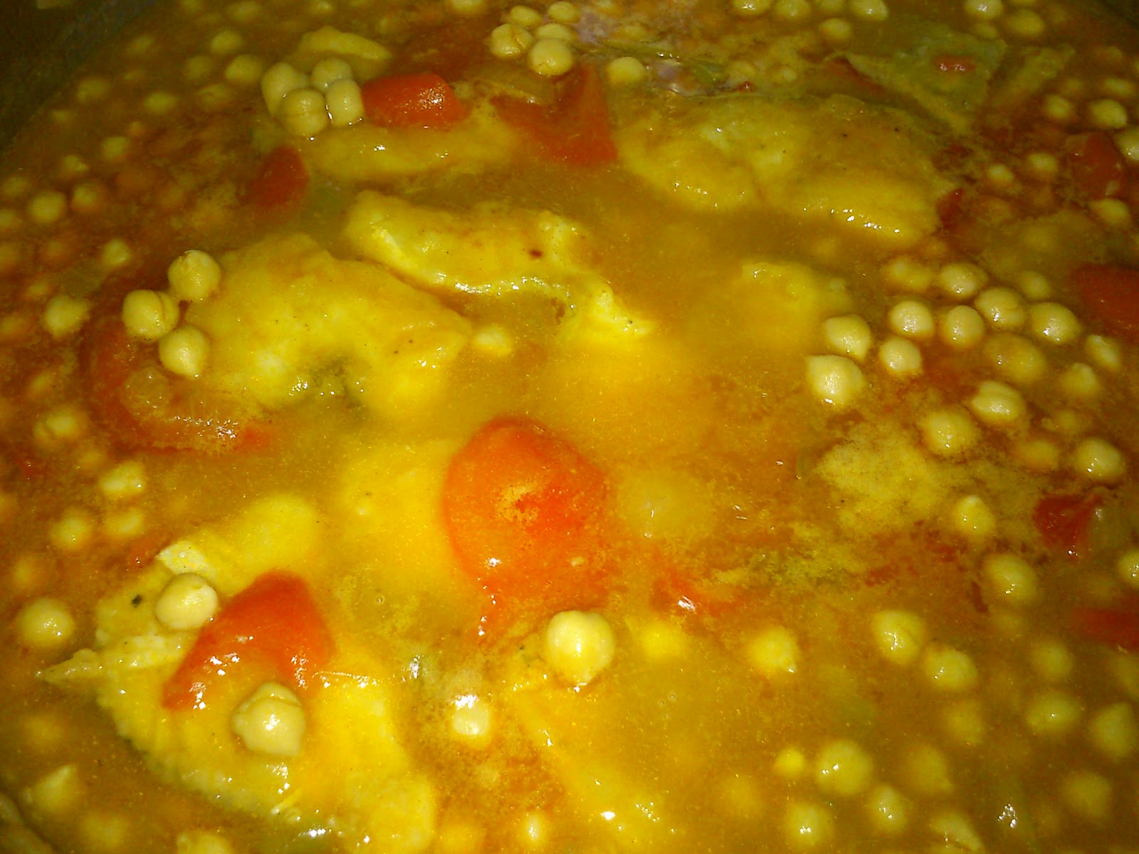 Preparé un sofrito con un poco de aceite, la cebolla, ajo y pimiento troceado, cuando lo tenia transparente le añadí el pimentón fuera del calor, agregue el caldo de bacalao y el agua suficiente para poder cubrir holgadamente mis garbanzos y la cabeza de pescado.